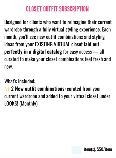 Designed for clients who want to reimagine their current wardrobe through a fully virtual styling experience. Each month, you’ll see new outfit combinations and styling ideas from your EXISTING VIRTUAL closet laid out perfectly in a digital catalog for easy access — all curated to make your closet combinations feel fresh and new.