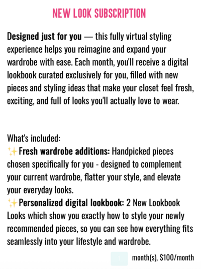 Designed just for you — this fully virtual styling experience helps you reimagine and expand your wardrobe with ease. Each month, you'll receive a digital lookbook curated exclusively for you, filled with new pieces and styling ideas that make your closet feel fresh, exciting, and full of looks you'll actually love to wear.