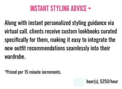 Along with instant personalized styling guidance via virtual call. clients receive custom lookbooks curated specifically for them, making it easy to integrate the new outfit recommendations seamlessly into their wardrobe.