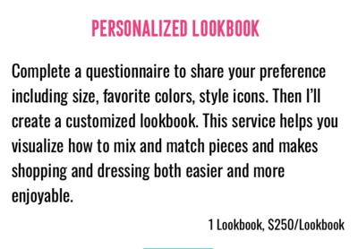Complete a questionnaire to share your preference including size, favorite colors, style icons. Then I’ll create a customized lookbook. This service helps you visualize how to mix and match pieces and makes shopping and dressing both easier and more enjoyable.