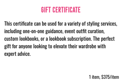 This certificate can be used for a variety of styling services, including one-on-one guidance, event outfit curation, custom lookbooks, or a lookbook subscription. The perfect gift for anyone looking to elevate their wardrobe with expert advice.